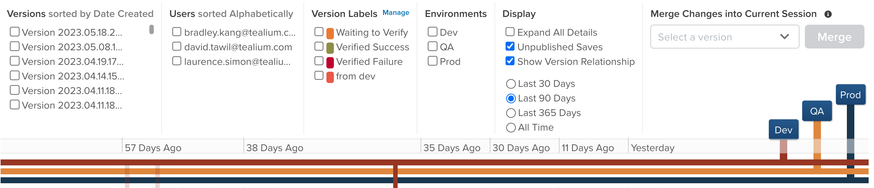- ダッシュボードでバージョン関係を表示するフィルタを有効にして、各バージョンが他のバージョンとどのように関連しているか、またどのバージョンをマージできるかまたはできないかを表示します。