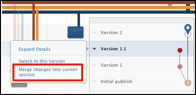 現在のセッションにマージ可能な変更がある場合、現在のセッションに変更をマージするオプションがバージョンアクションのリストとバージョン図の上に表示されます。