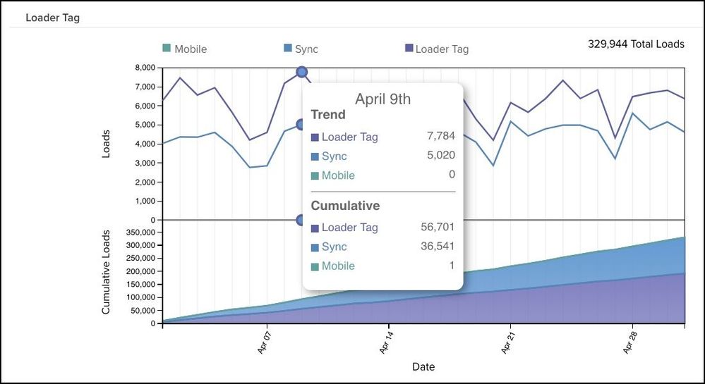 ローダータグレポートは、指定した期間中に発生するタグリクエスト(ロード)の数を表示します。utag.js、utag.sync.js、およびmobile.htmlファイルリクエストのロードがプロットされます。