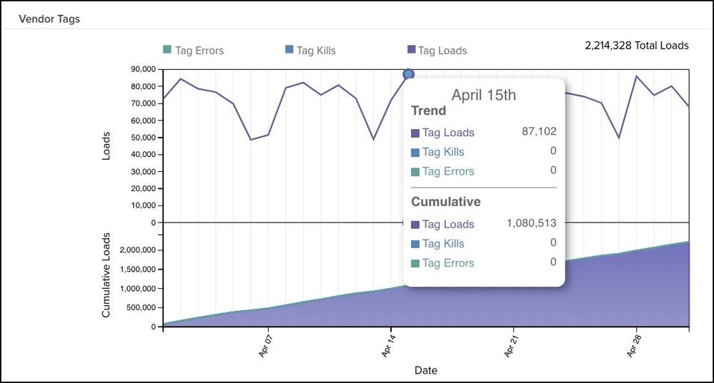 ベンダータグレポートは、指定した日付範囲内の特定の日にベンダータグ(utag.\*.js)がロードされた回数を表示します。