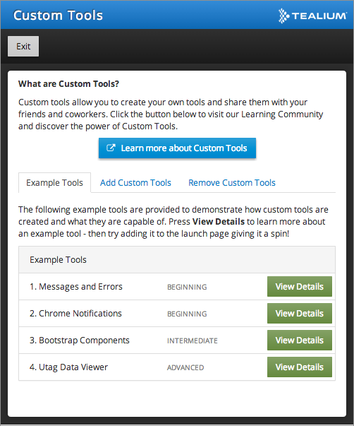 利用可能なカスタムツールの完全なリストについては、Tealium Toolsを参照してください。