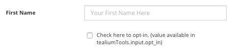 inputプロパティには、表示するフォームフィールドを定義する追加のオブジェクトが含まれています。inputオブジェクトは、その値がJavaScriptでtealiumTools.inputオブジェクトを使用して参照できるフォームフィールドを生成します。inputオブジェクトの各キーはフィールド名を定義します。