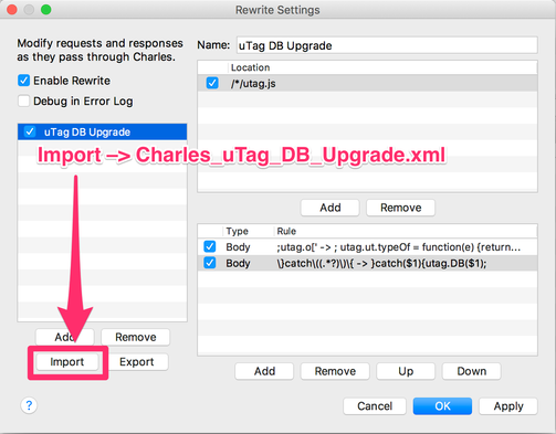 Charles Rewrite Settings (ツール > 書き換え)を開きます。