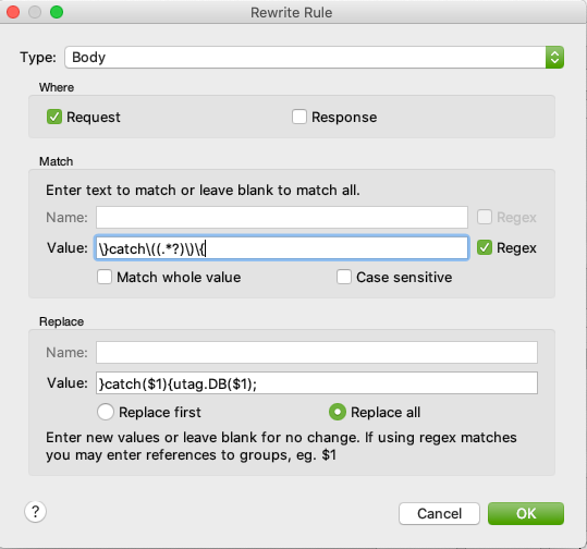 置換セクションの値フィールドに以下を配置します\}catch\((.*?)\)\{}catch($1){utag.DB($1); - マッチセクションで、正規表現ボックスがチェックされていることを確認します。