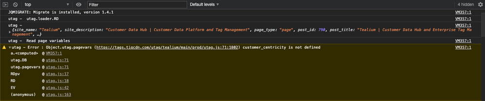 Tealiumをロードしているブラウザウィンドウを更新します。これで、コンソールに警告の出力が表示されるようになります。下のサンプルを参照してください。
