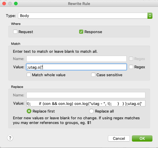 置換セクションの値フィールドに以下を配置します:;utag.o['; utag.ut.typeOf = function(e) {return ({}).toString.call(e).match(/\s([a-zA-Z]+)/)[1].toLowerCase();}; utag.DB = function(a, b) { var t; if (utag.cfg.utagdb === false) { return; } else if (typeof utag.cfg.utagdb == "undefined") { utag.db_log = []; b = document.cookie + ''; utag.cfg.utagdb = ((b.indexOf('utagdb=true') >= 0) ? true : false); } if (utag.cfg.utagdb === true) { var con = window.console; if (utag.ut.typeOf(a) === "error") { utag.db_log.push(a); t = ""; if (a.stack && a.stack.split) { t = a.stack.split("\n")[1].replace(/^[\s\uFEFF\xA0]+|[\s\uFEFF\xA0]+$/g, '').replace(/^at\s/, ""); } if (con) { t = "utag - Error : " + t + " "+ a.message; if (con.warn) { con.warn(t); } else if (con.log){ con.log(t); } } } else { t = (utag.ut.typeOf(a) == "object") ? utag.handler.C(a) : a; utag.db_log.push(t); if (con && con.log) con.log("utag - ", t); } } };utag.o[' - 置換セクションで、最初に置換オプションが選択されていることを確認します。