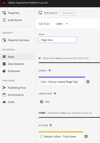 Tealium Collect拡張機能を発火するルールを作成します。次の例は、ページビューイベントの拡張機能を実行します。