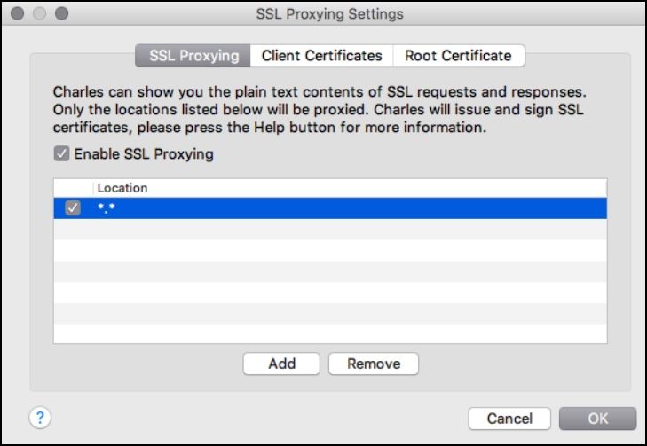 - SSL Proxyingタブをクリックし、Enable SSL Proxyingチェックボックスを選択して、ロケーションを構成します。