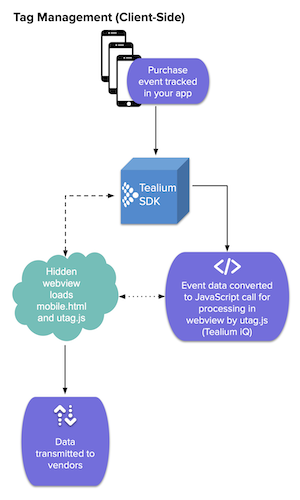 以下の図は、訪問がモバイルアプリを使用する際に、iQタグ管理がベンダータグ構成をロードする方法を示しています。この例では、Tealium SDKがトラッキングされた購入イベントを隠されたwebview内のJavaScriptトラッキングコールに変換する方法を示しています。ベンダータグは隠されたwebview内で実行され、トラッキングデータはアプリ(クライアントサイド)から直接ベンダーに送信されます。