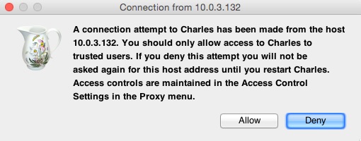 - iOSデバイスでプロキシ構成を保存すると、コンピュータ上のCharlesから接続を許可するように求めるアラートが表示されます。Allow をクリックします。