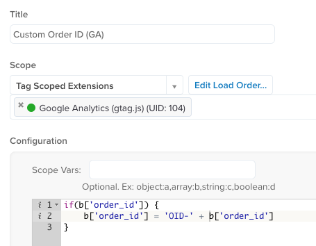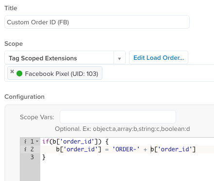 これらの例では、データレイヤー変数order_idがJavaScript Code拡張を使用して各タグでカスタマイズされています。各拡張では、bはorder_idの同じ値から始まります: