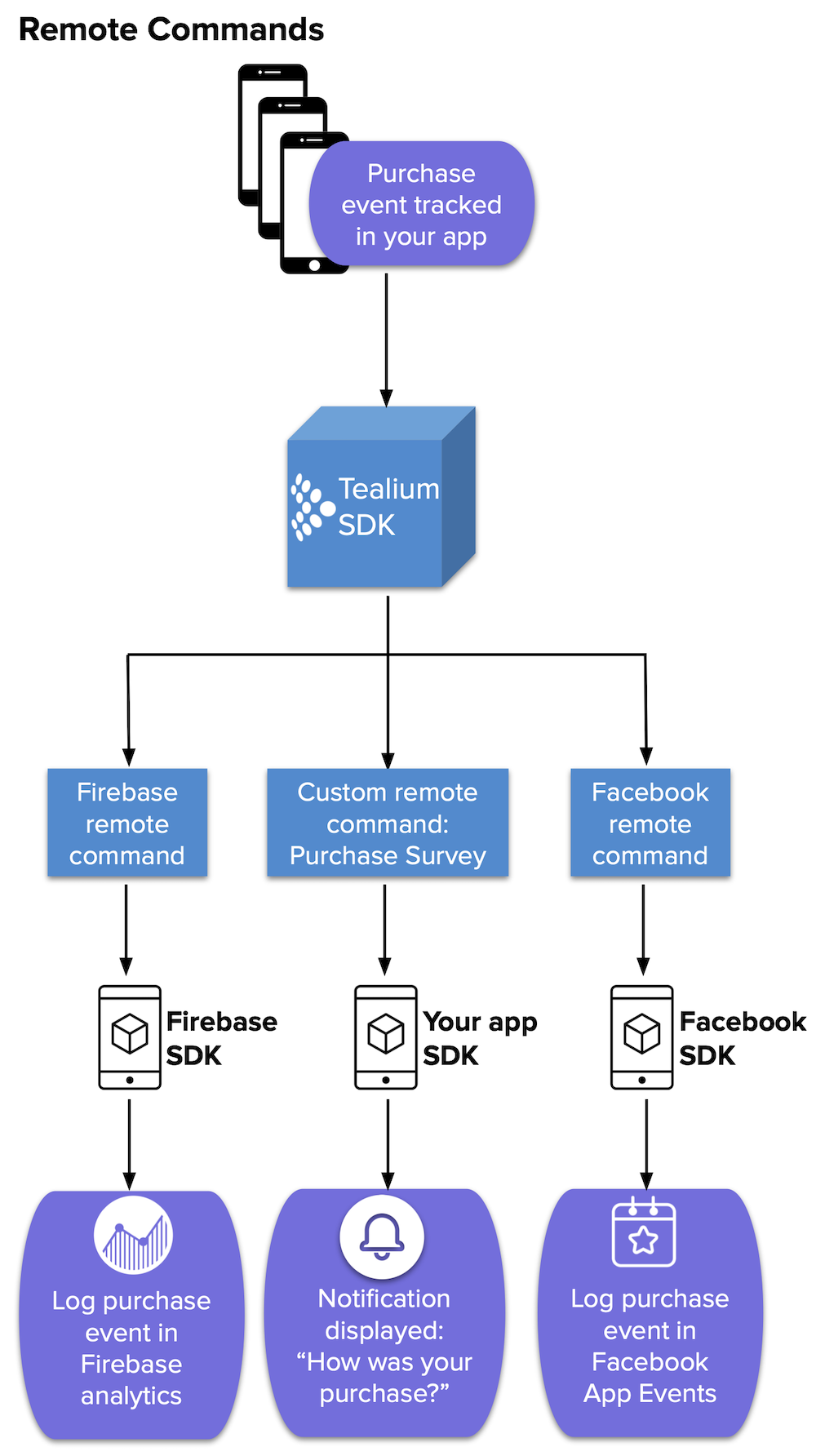 以下の図は、ベンダー統合とカスタムリモートコマンドがネイティブアプリの機能をどのようにトリガーするかを示しています。アプリで追跡された訪問の購入から始まり、Tealium SDKはFirebase、Facebook、または独自のカスタムリモートコマンドのようなアプリでリモートコマンドをトリガーします。リモートコマンドは、Firebaseでの購入のログ記録、Facebook App Eventsでのイベント追跡、またはアプリでのカスタム通知の表示など、SDKで利用可能な任意のネイティブメソッドをトリガーすることができます。