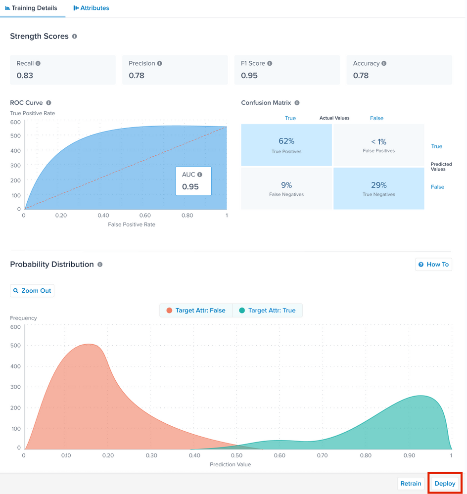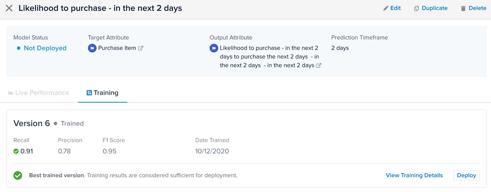 - トレーニング詳細画面から、トレーニングの詳細を確認した後、デプロイを選択できます。