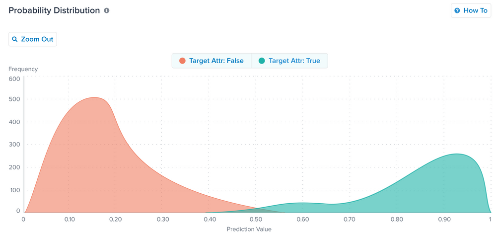 このチャートの2つの色付き曲線は、モデルがトレーニング中に行った真実と偽の予測の分布を表しています。モデルの訓練プロセスは歴史的なデータを使用し、各訪問が目標とする行動を実際に行ったかどうかを知っているため、歴史的な訪問に対する予測と実際の結果を比較してモデルをテストすることが可能です。この比較の目的は、訓練データセットの一部をテストサブセットとして確保することです。