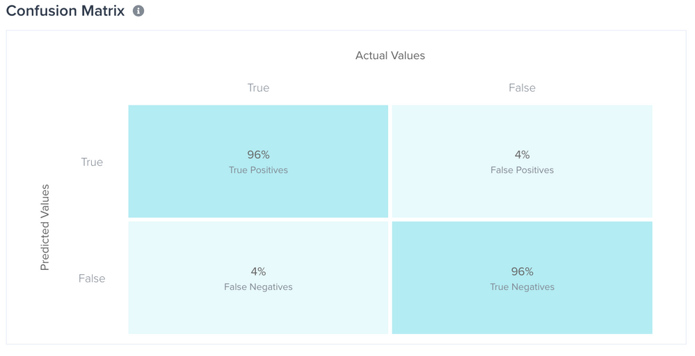 訓練済みモデルの混同行列にアクセスするには、モデルダッシュボード > モデル詳細を表示 > 訓練 > 訓練詳細を表示に移動します。混同行列を使用すると、真または偽の予測値と真または偽の実際の値を比較することで、これらの予測の精度を簡単に確認することができます。以下の説明にあるように、4つの可能なシナリオがあります。
