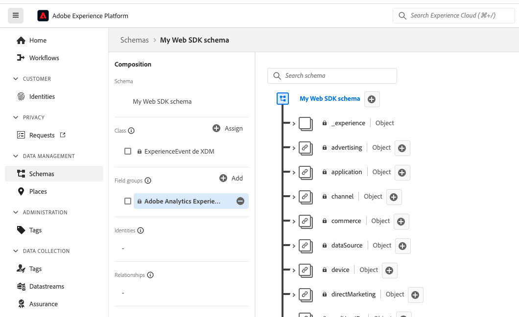 - Adobe Experience Platformで、Data Management > Schemasに移動し、使用するスキーマを選択するか、Create Schemaをクリックして新しいスキーマを作成します。