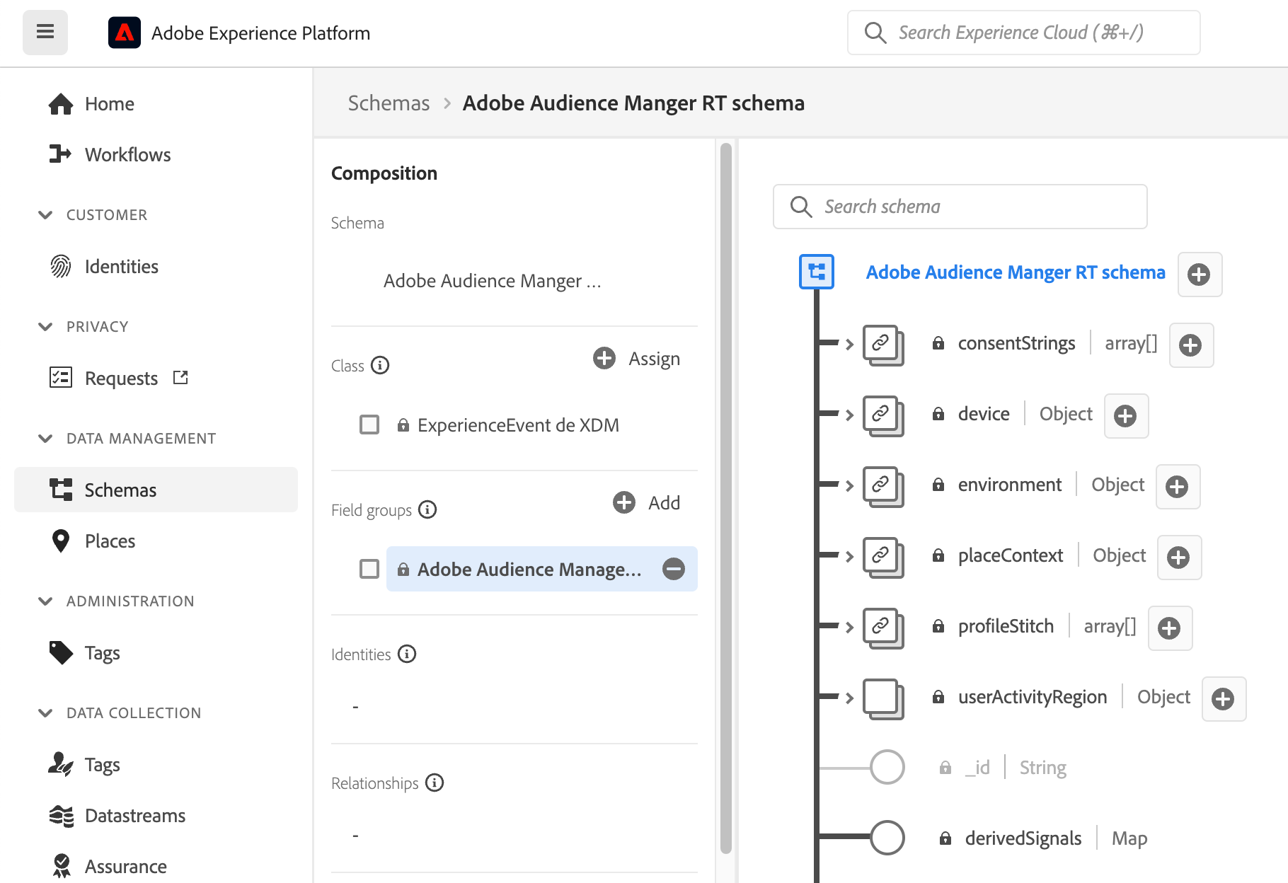 - スキーマの詳細画面で、Field groupsセクションに移動し、Adobe Audience Manager Templateを選択し、Saveをクリックします。