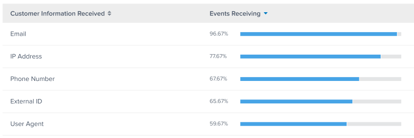 顧客情報の概要は、イベントタイプの詳細を表示します。概要テーブルは、イベントタイプで受け取ったすべての顧客情報パラメータと、各パラメータを受け取るイベントの割合を表示します。顧客情報を含むイベントの割合が高いほど、EMQスコアが改善する可能性が高くなります。