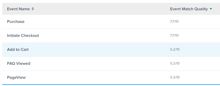 各イベントタイプには、1から10までのイベントマッチ品質スコアがあります。このスコアは、それらのイベントの顧客情報が既存のFacebookアカウントとどれだけ一致しているかを示しています。