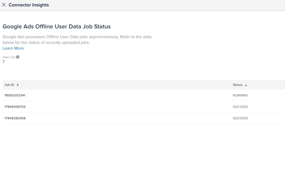 ジョブIDの概要は、Google Adsプラットフォームでのレコードの処理状況を示します: