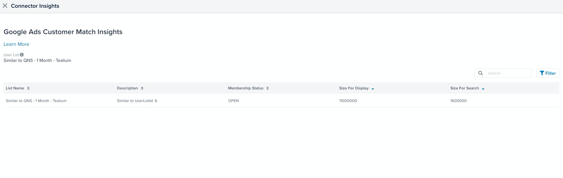 Google Ads Customer Match insightは、Google Ads API user_list queryを実行して、構成したオーディエンスに関する情報を提供します。