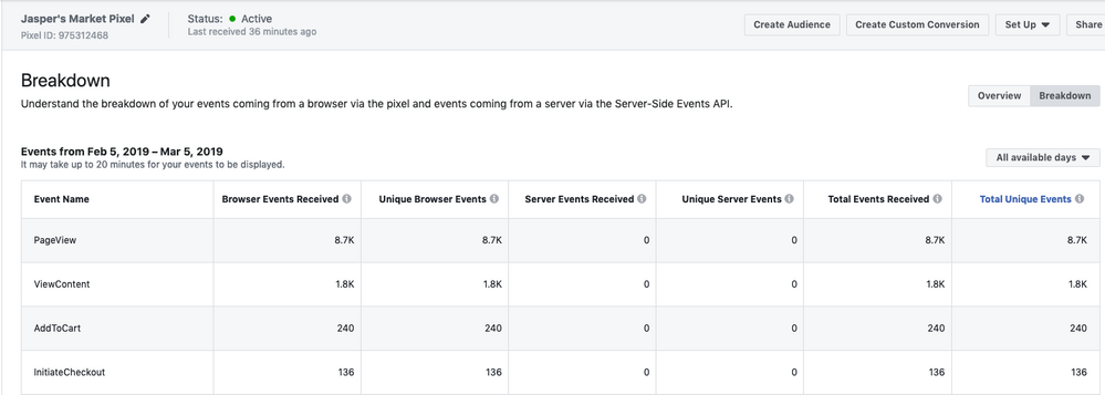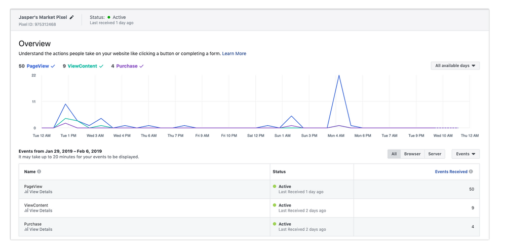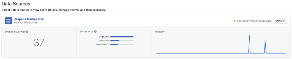 - Facebookイベントマネージャーピクセルの概要を確認して、イベントが受信されたことを確認します。