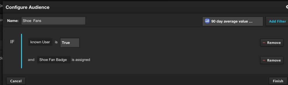 次に、Shoe Fansというタイトルのオーディエンスを作成し、Shoe FanバッジとKnown User ブール属性がtrueのすべての訪問がオーディエンスに追加されるようにロジックを構成します。
