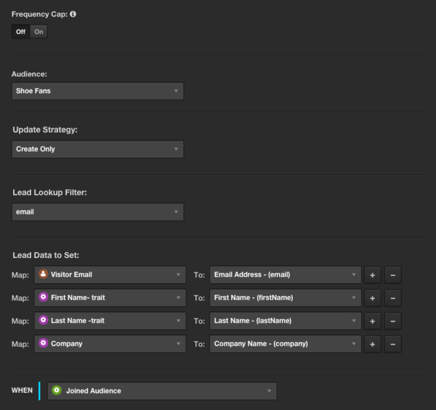 リードは関連付けられる情報によってのみ有効ですので、適切なデータと値をマッピングします。Lead Data to Setの下で、ステップ1で作成した属性とその他の属性を選択し、それらを対応する値にマッピングします。