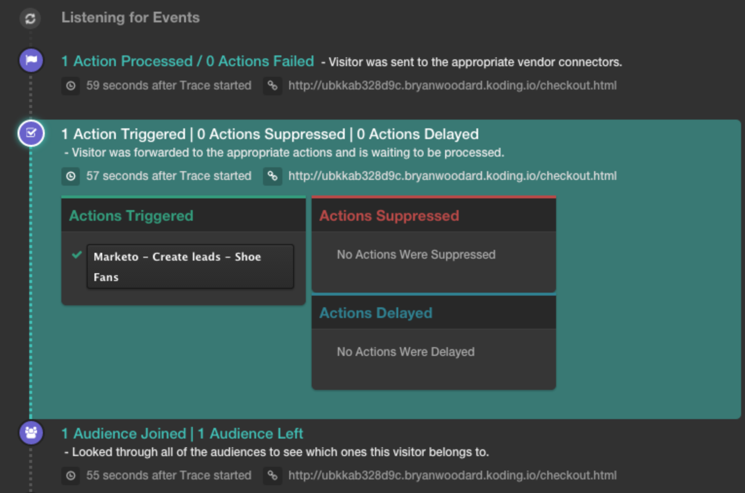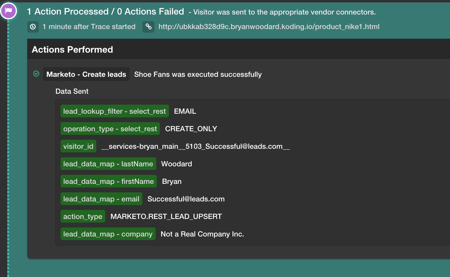 構成を完了したら、テストする必要があります。構成をテストする最良の方法は、トレースを実行してイベントが適切に処理され、Marketoダッシュボードでリードが正しく作成されたかどうかを確認することです。
