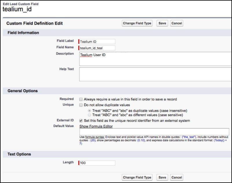 Tealium for Salesforceソリューションは、共有識別子属性を指定することで、Customer Data HubからSalesforceへのレコードのリンク付けが可能です。Customer Data Hubでは、この属性は、インジェスシンク(オムニチャネルのアップロードなど)から来るレコードを一意に識別する任意のビジターID属性であることができます。Salesforceでは、オブジェクトにTealium IDという名前のカスタムフィールドを作成する必要があります。