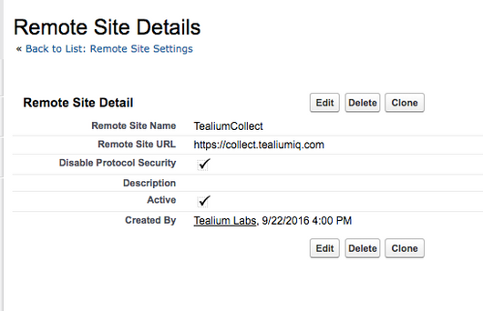 HTTPリクエストを送信するために、Tealium CollectエンドポイントをSalesforceのリモートサイト構成に登録する必要があります。