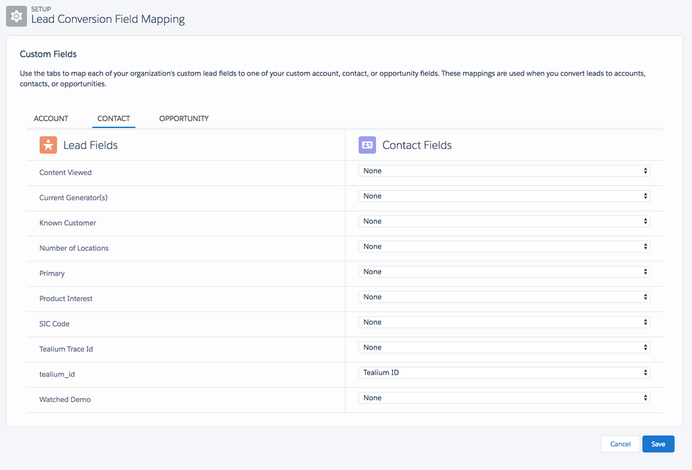 リードを連絡先に変換する際に、カスタムフィールドTealium IDを保持するために、Lead.Tealium IDをContact.Tealium IDにマッピングする必要があります。