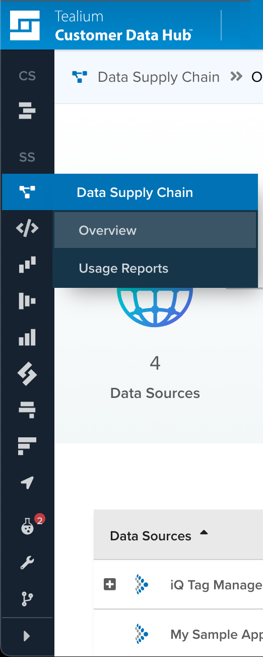 ナビゲーションバーはTealiumウィンドウの左側に表示されます。利用可能なすべての製品、機能、ツールへのリンクが含まれています。任意の項目をクリックして、Tealiumウィンドウでそれをロードします。クライアントサイドのiQタグ管理リンクをクリックすると、ブラウザで新しいタブが開き、クライアントサイドのプロファイルがロードされます。