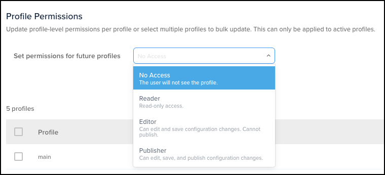- 未来のプロファイルのための権限を構成リストで、アカウントに新たに作成されるプロファイルのユーザーに割り当てるロールを選択します。