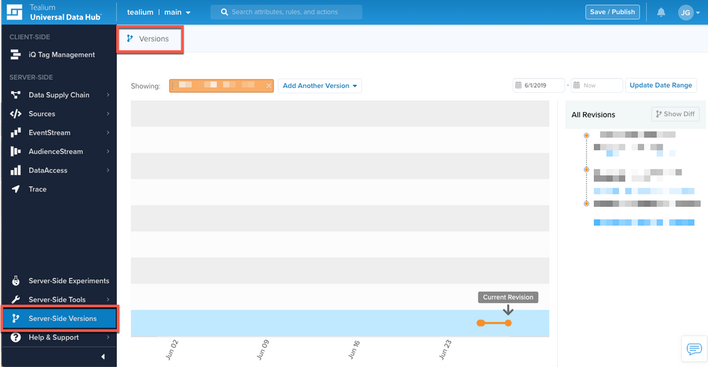 サイドバーで Server-Side Versions をクリックすると、Customer Data Hubのバージョン履歴がわかりやすく表示されます。