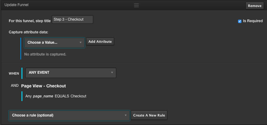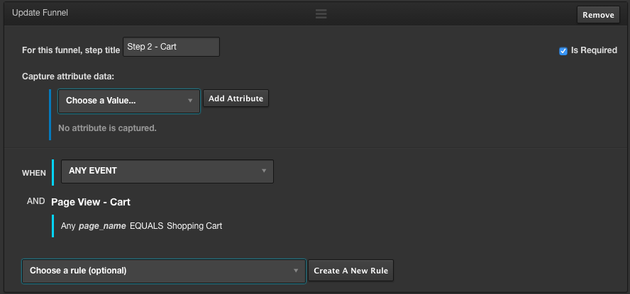 このエンリッチメントを使用して、ファネル内のステップを作成します。ファネルステップを追加するにつれて、リストの一番上に表示されるステップがファネル内の最初のステップであり、一番下に表示されるステップが最後(必須)のステップです。新しいステップはリストの一番上に追加されます。