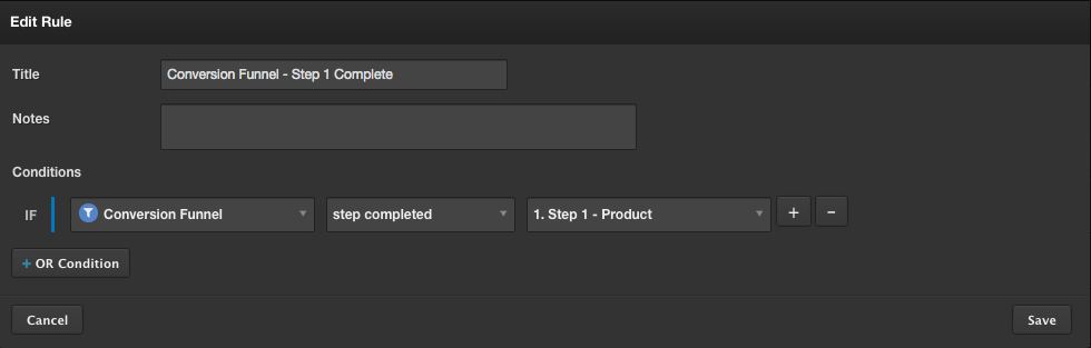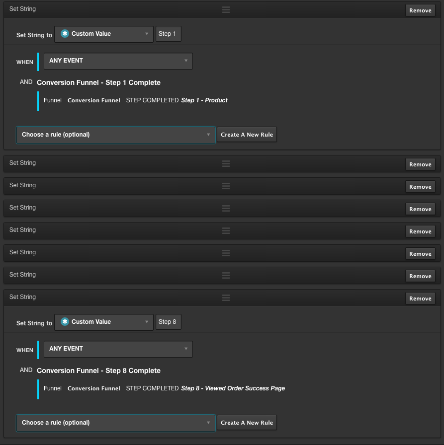まず、ファネルの各ステップに対して複数のルールを作成する必要があります。たとえば、ルール Conversion Funnel - Step 1 Complete は、Step 1 - Product が完了したかどうかをチェックします。