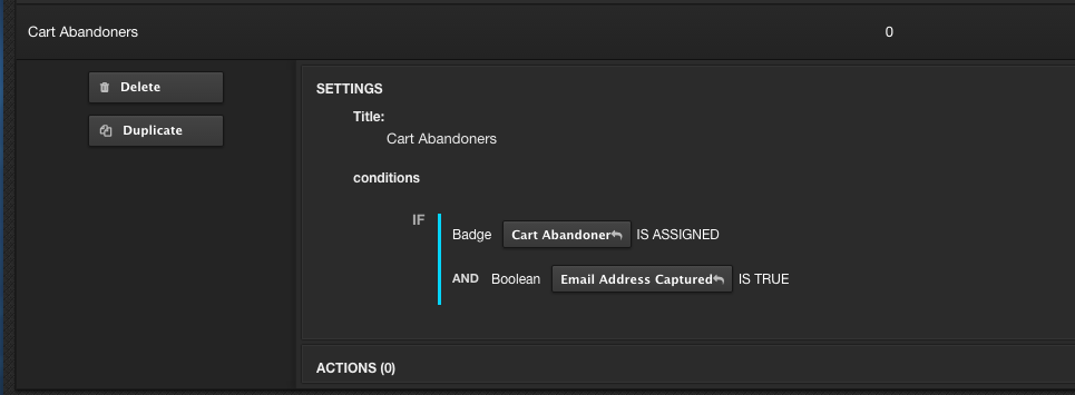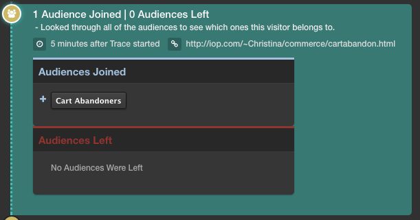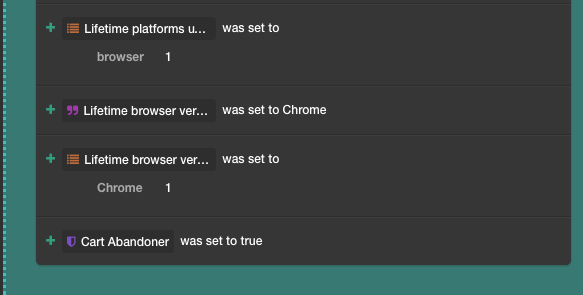 最後に、セッションの終了時に Cart Abandoner バッジが割り当てられ、Cart Abandoners オーディエンスに参加し、関連するコネクタがトリガーされることに注意してください。