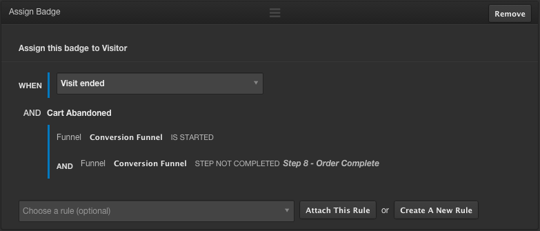 離脱はセッションの終了時に判断する必要があります。これにより、すべてのページビューが考慮されます。これを行うには、Cart Abandoner というバッジを作成し、訪問の最後にファネルを確認し、ファネルが開始されたが完了していない場合にバッジを割り当てます。