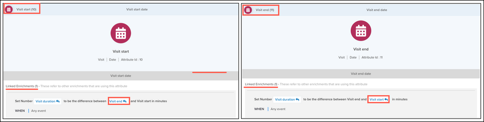 2つ以上のエンリッチメントが同じ属性に依存している場合、それらは_リンクされたエンリッチメント_となります。以下の例は、訪問の開始と終了に適用されたエンリッチメントを示しています。Visit Start属性のエンリッチメントはVisit End属性を使用し、その逆も同様です。各エンリッチメントが属性によって他方にリンクされているため、それらはリンクされたエンリッチメントと見なされます。