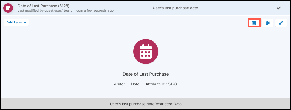 ホーム > サーバーサイド > 属性 > 属性を管理する 属性を削除する この記事では、属性を削除する方法について説明します。 左のナビゲーションバーから、AudienceStream > Visitor / Visit Attributesに移動して属性を表示します。左側の利用可能なオプションをクリックして表示をフィルタリングすることもできます。詳細を表示するには、目的の属性をクリックします。 以下の手順で属性を削除(または削除)します: 削除したい属性をクリックします。 ゴミ箱のアイコンをクリックします。 削除しようとしている属性が現在ルール、エンリッチメント、またはオーディエンスで使用されている場合、次のメッセージが表示されます: 属性を削除するには、ルール、エンリッチメント、またはオーディエンスから削除してから再試行します。 Delete Attribute ダイアログで、Delete をクリックして属性を削除します。 プロフィールを保存して公開し、変更を適用します。 "属性を編集する " 属性を編集する このページはお役にたちましたでしょうか? はい いいえ フィードバックを送信 ご意見有難うございます。 最終更新日 :: 2024年March月28日