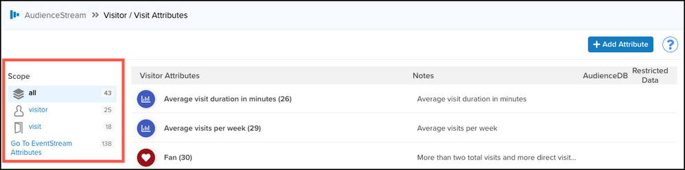 左のナビゲーションバーから、AudienceStream > Visitor / Visit Attributesに移動して属性を表示します。左側の利用可能なオプションをクリックして表示をフィルタリングすることもできます。詳細を表示するために希望の属性をクリックします。