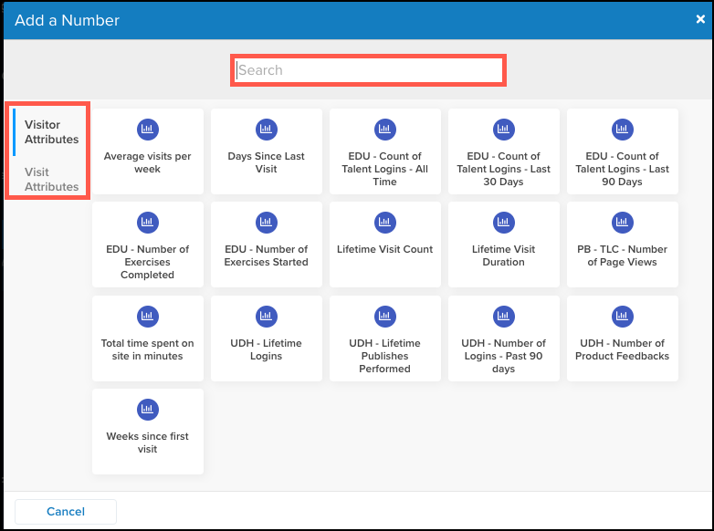- Searchフィールドを使用して特定の属性を検索するか、訪問または訪問の属性によって利用可能な属性をフィルタリングします。