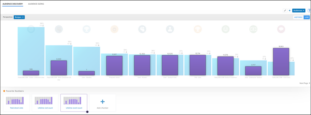 お気に入りの数字にアクセスするには、AudienceStream > Discoverに移動します。Favorite Numbersセクションは、メインのAudience Discoveryチャートの直下にあります。