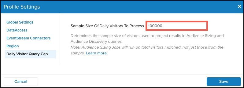 訪問は、日別訪問数を上限としてサンプリングされ、これがオーディエンスサイジングとオーディエンスディスカバリークエリの結果を予測するために使用される訪問のサンプルサイズを決定します。実際のクエリは、上限に達した訪問だけでなく、合計訪問数に対して実行されます。同様に、ジョブもサンプリングされた訪問だけでなく、一致した訪問の総数に対して実行されます。