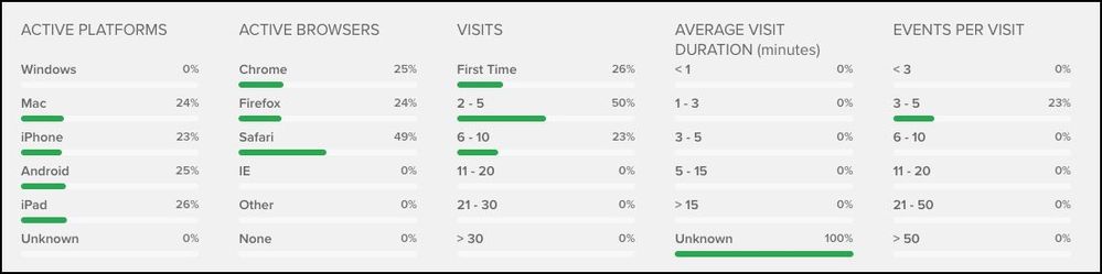 検出されたプラットフォームとブラウザを使用する訪問の割合、アクティブな訪問、訪問の平均時間、訪問あたりのイベント数を表示します。