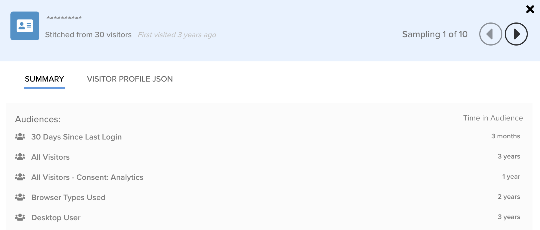 ビジタープロファイル分布チャートの任意のバー、バッジ、またはオーディエンスをクリックして、サマリーまたは生のJSONビューでビジタープロファイルのサンプルデータセットを表示します。