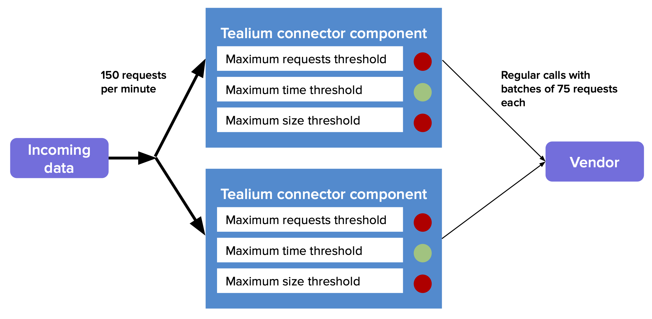 実際には、Tealiumコネクタには複数のバッチングコンポーネントがあります。この例では、同じデータ流入(毎分150リクエスト)を持つ2つのバッチングコンポーネントがあります。リクエストは2つのコンポーネント間で均等に分散されます。各コンポーネントは自身のバッチを独立して監視するため、各コンポーネントへのデータ流入は現在毎分75リクエストだけです。このデータ流量は最大リクエスト数閾値をトリガーするのに十分高くありません。この場合、データ流量は最初に最大時間閾値をトリガーします。それでもベンダーAPIへの定期的な呼び出しを見ることができますが、それぞれには75レコードだけが含まれます。