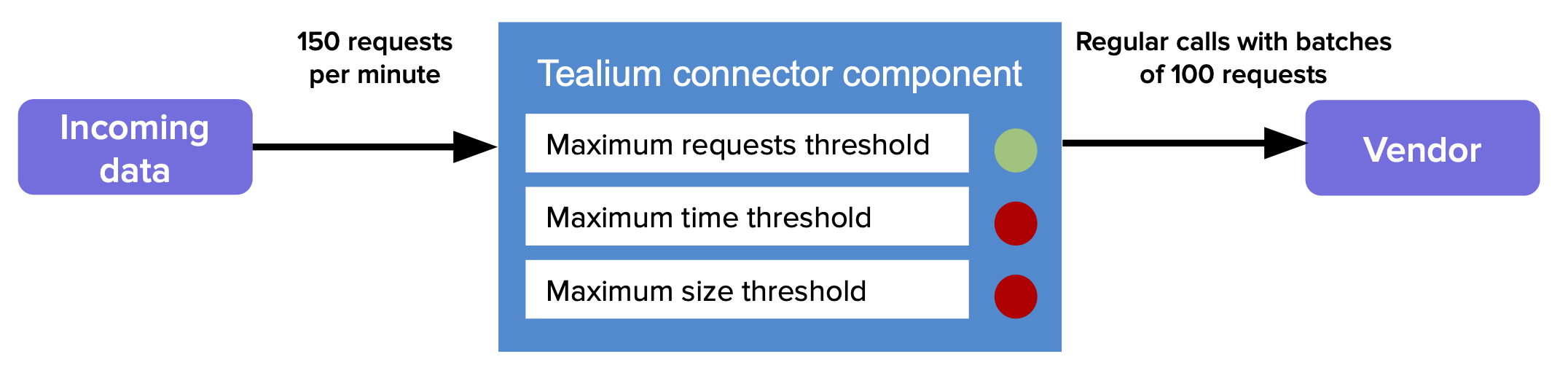 この例では、Tealiumコネクタは単一のバッチングコンポーネントを持っています。それは毎分150リクエストの一定のデータ流入を受け取り、150リクエストのサイズは10MB未満です。