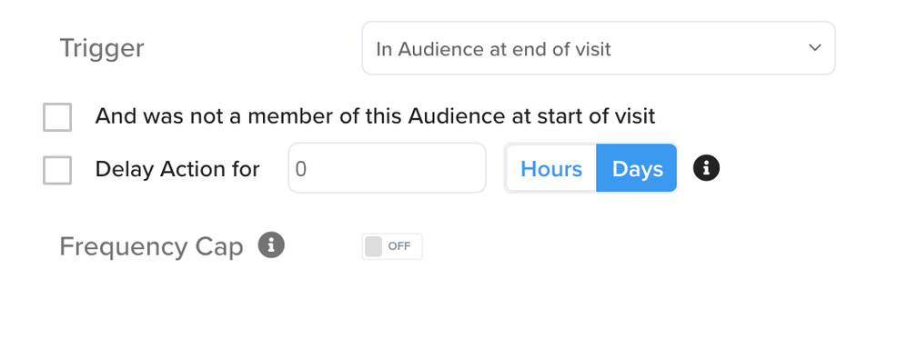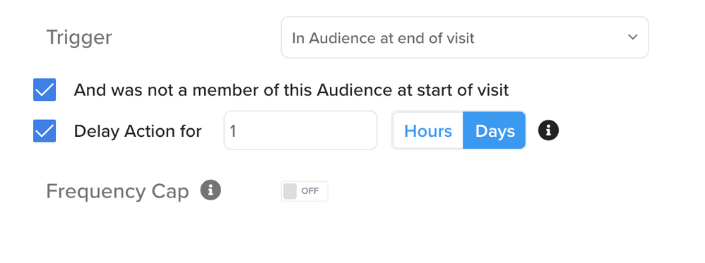 - 訪問が現在の訪問の開始時にオーディエンス内にいなかったかつ訪問終了時にオーディエンス内にいる場合、遅延アクションは1日後にスケジュールされます。